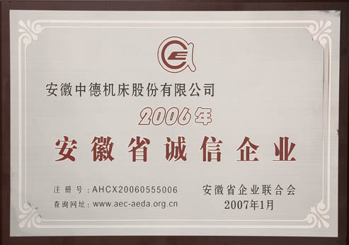 近日我公司被安徽省企業聯合會評為2006年“安徽省誠信企業”。