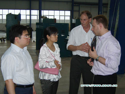 盡管天氣非常炎熱,下午還下起了暴雨,但這絲毫沒有影響他們參觀的熱情!稍作休息后,Peter和Daniel 就迫不及待的隨同公司領導及工作人員來到了我們的大型裝配車間,在這里,他們審視的眼光掃過每一臺機器,然后都滿意的點點頭。期間不斷的向隨行的工作人員提問,非常的認真,我們的工作人員都耐心的一一解答。