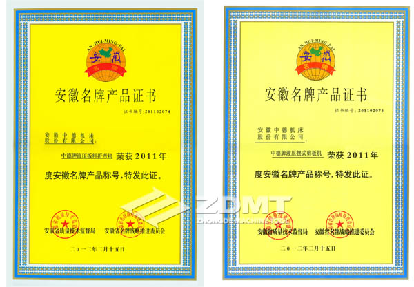 2012年3月22日,馬鞍山市召開了全市質量技術監督工作會議,會議對2011年獲得質監部門相關榮譽的企業與個人進行了表彰,我公司中德牌液壓擺式剪板機和中德牌液壓板料折彎機兩個產品分別通過了2011年“安徽名牌”的復審。